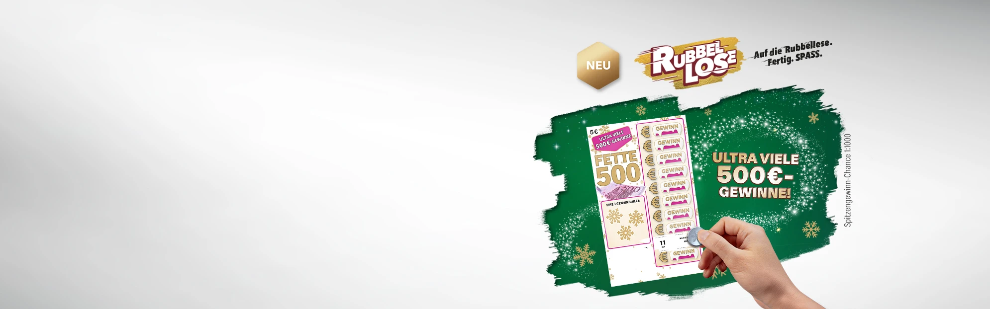 Die Fette 500 Winter – Goldene Schneeflocken bieten die beste Chance auf einen 500 €-Gewinn bei WestLotto Rubbellosen! Jetzt ausprobieren! In den WestLotto-Annahmestellen oder online erhältlich.